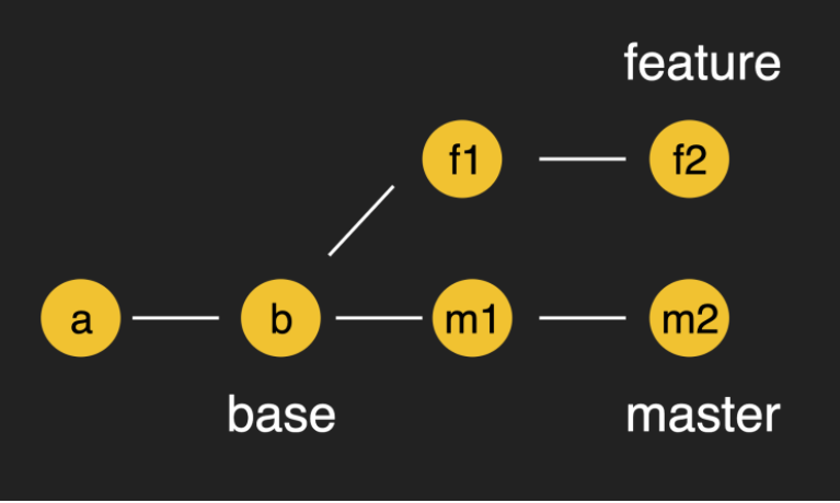 예를 들어 게시판 기능을 개발하는 feature f1 ->f2 브랜치를 완성된 뒤 개발 완료된 M2 브랜치를 바로 이어서 붙이고 싶다면 rebase를 사용하면 됩니다. rebase를 이용하면 이런 식으로 붙여지게 됩니다.