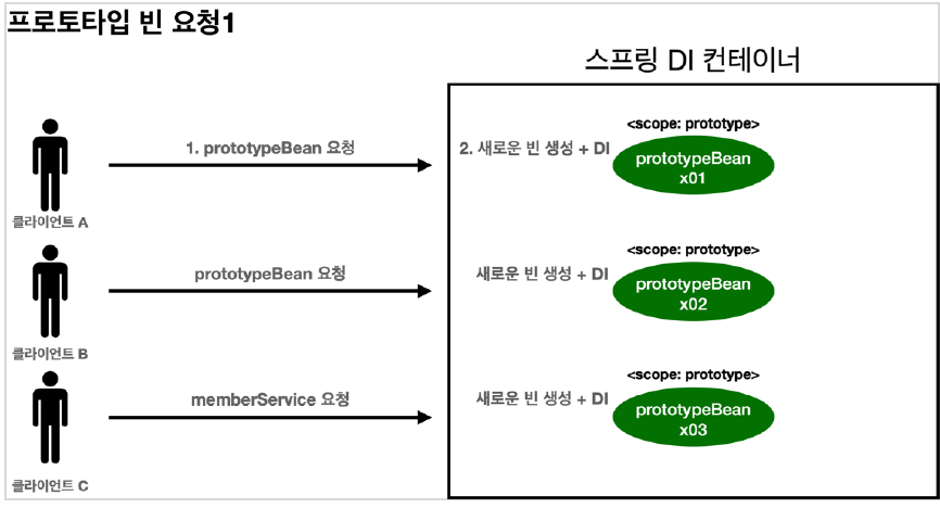 프로토타입 스코프의 빈을 스프링 컨테이너에 요청합니다. 그 뒤에 스프링 컨테이너는 이 시점에 프로토타입 빈을 생성하고, 필요한 의존관계를 주입합니다.