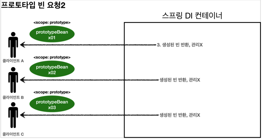 여기서 핵심은 스프링 컨테이너는 프로토타입 빈을 생성하고, 의존관계 주입, 초기화까지만 처리한다는 것입니다. 클라이언트에 빈을 반환하고, 이후 스프링 컨테이너는 생성된 프로토타입 빈을 관리하지 않습니다. 프로토타입 빈을 관리할 책임은 프로토타입 빈을 받은 클라이언트에 있습니다. 예를 들어 클라이언트에서 프로토타입의 빈을 요청하면, 스프링 DI 컨테이너는 해당 프로토타입 빈을 반환 즉시 관여하지 않습니다. 만약 종료 메서드가 필요하면 클라이언트에서 직접 종료 메서드를 사용해야합니다. 스프링 DI 컨테이너 안에서 @PreDestroy 같은 종료 메서드가 호출되지 않습니다.