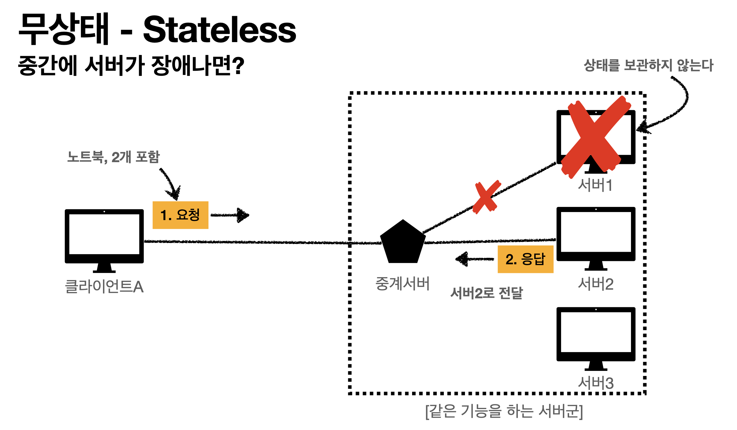 중간에 서버 1이 장애가 발생해도 중계서버가 요청을 바로 서버 2로 던져주면 해결할 수 있습니다. 또한,