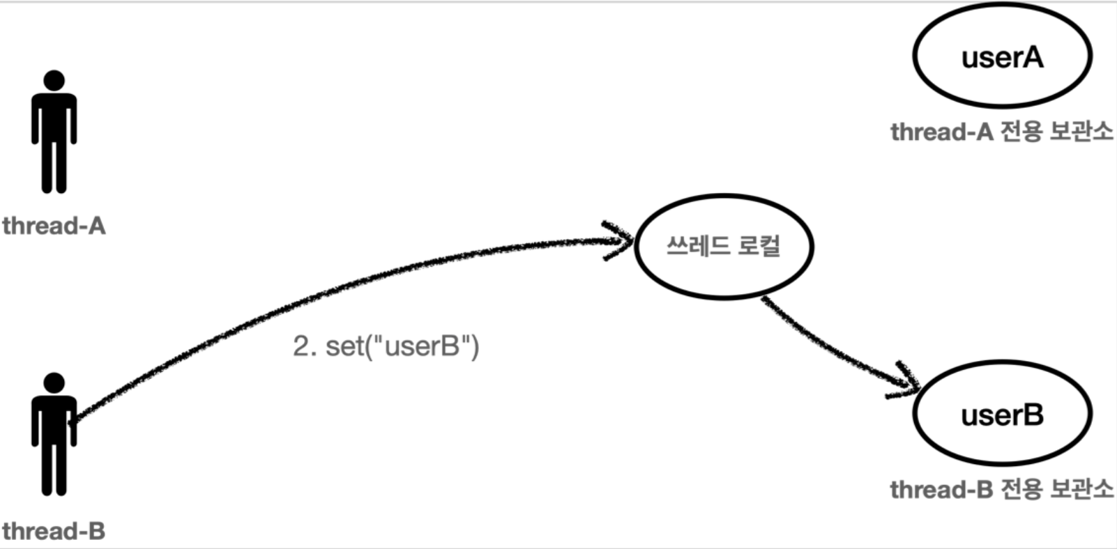 마찬가지로 hread B가 userB라는 정보를 저장하게 되면 ThreadLocal은 Thread B 저장 보관소에 보관하게 됩니다.