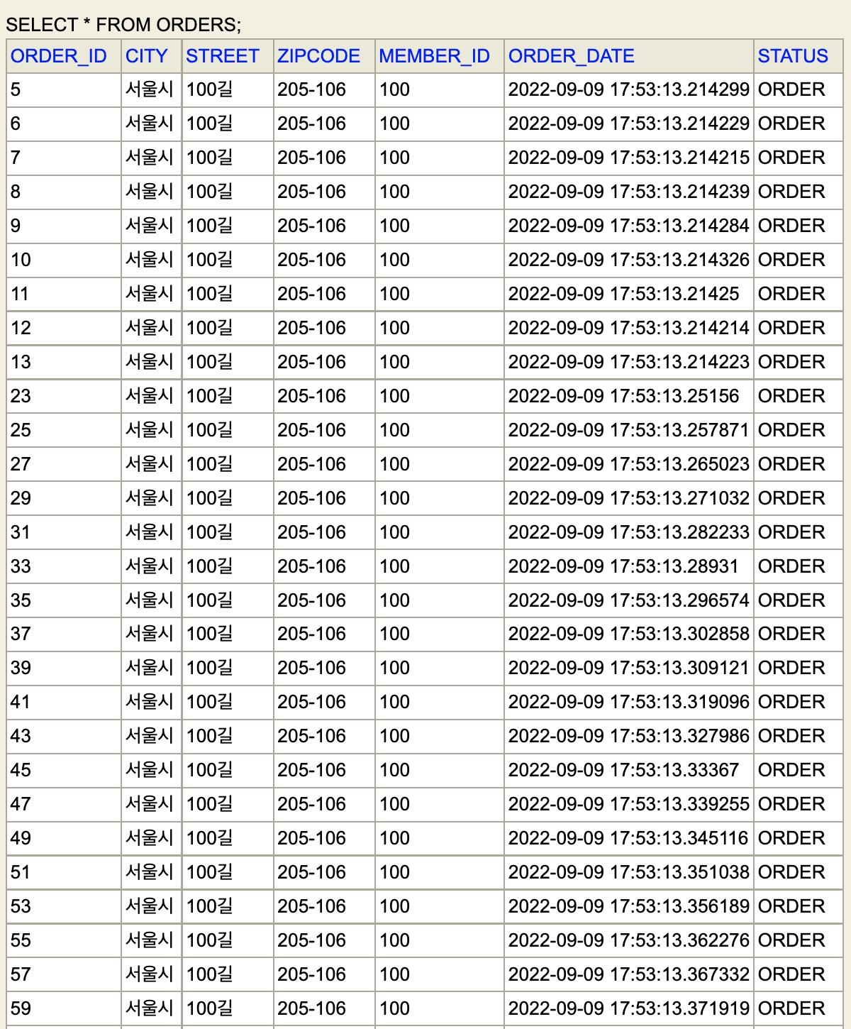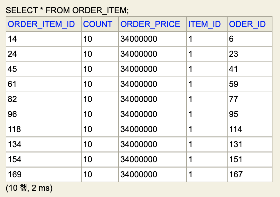 주문 테이블에 정확이 10개의 주문이 들어가는 것을 볼 수 있습니다.