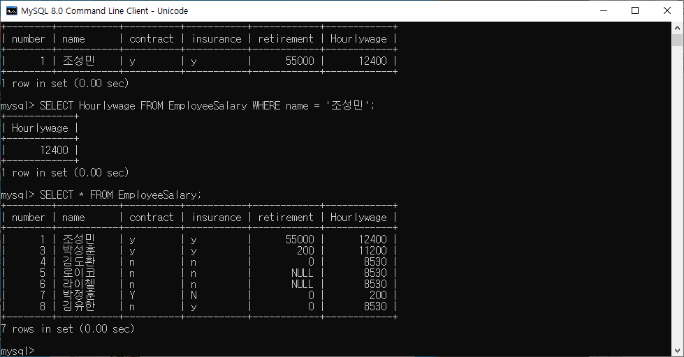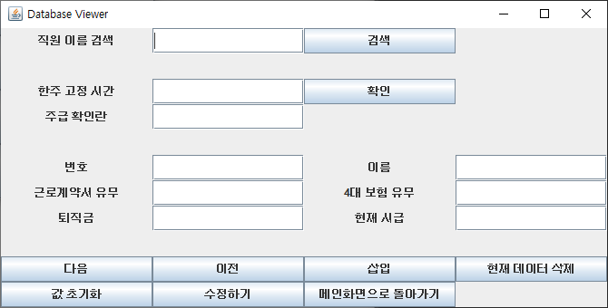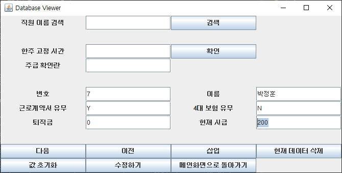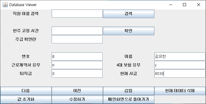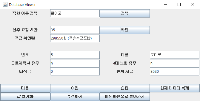 SELECT Hourlywage FROM EmployeeSalary WHERE name = "+"'"+search.getText()+"'"를 rs1에 대입하였습니다. EmployeeSalary 테이블에서 시급 필드만 선택해 search필드에서 이름을 입력값을 가져와 대입하였습니다. 또한 String타입으로 되어있어 Integer.parseInt를 통해 int형으로 형 변환을 시켜주어 주급을 result 값에 넣어 계산하였습니다. coin은 주휴수당을 계산한 것으로 공식을 살펴보면, (주에 일 한 시간/40(최대근로시간))*8*현재시급 이렇게 보여집니다. 이것도 똑같이 형 변환을 통해 int형으로 바꿔주어 계산합니다. 적용을 시키면 아래와 같이 보여집니다. 다음이나 이전으로 돌아가 찾아서 시급을 입력하여도 똑같이 적용이 됩니다. 그 이유는 어차피 Hourlywage 값을 가져오는 것이기 때문에 상관없습니다.