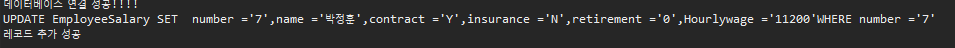 스트링 s에 "(" + string + ",'" +name +"','" + contract + "','" +insurance + "','" +retirement +"','"+Hourlywage+"')" ;를 넣어 연결 시켜주었습니다. stmt.executeUpdate(s);를 통해 삽입이 되었는지 확인하고 출력하게 됩니다.
