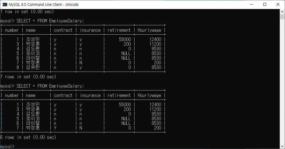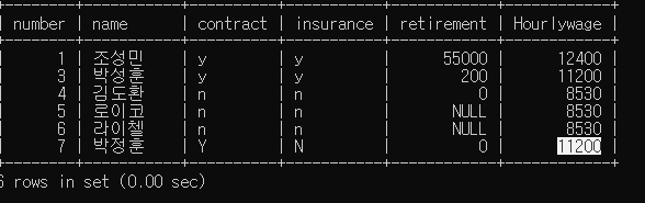직원 테이블입니다. 순번,이름,근로계약서유무, 4대보험유무, 퇴직금, 현재 시급 이렇게 구성되어있습니다.