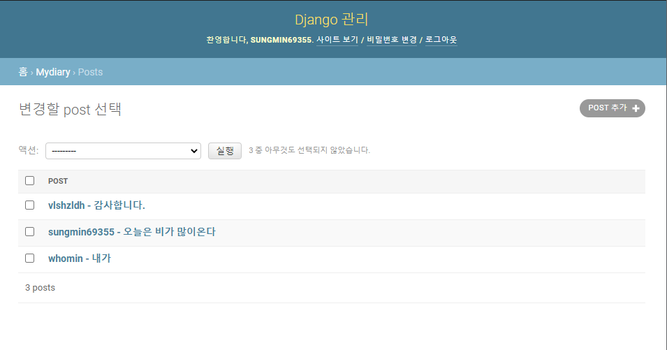 이렇게 admin페이지에서 보여지는 것입니다. 이렇게 보여주기위해서는 mydiary(자신의 앱)안에있는 admin.py파일로 가셔서