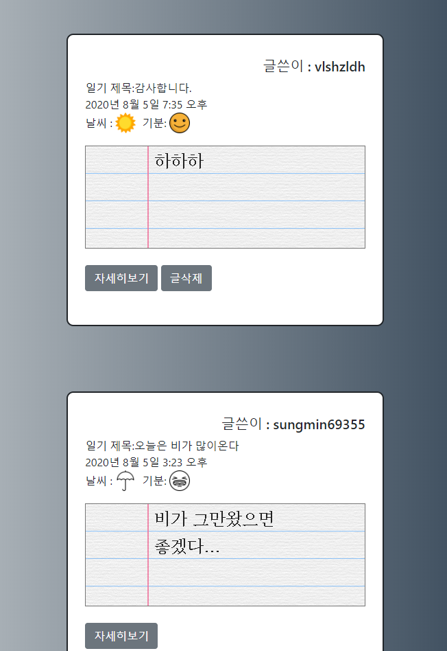 이런 식으로 글을 보여주지만, 자신의 글만 삭제할 수 있도록 만들었습니다.