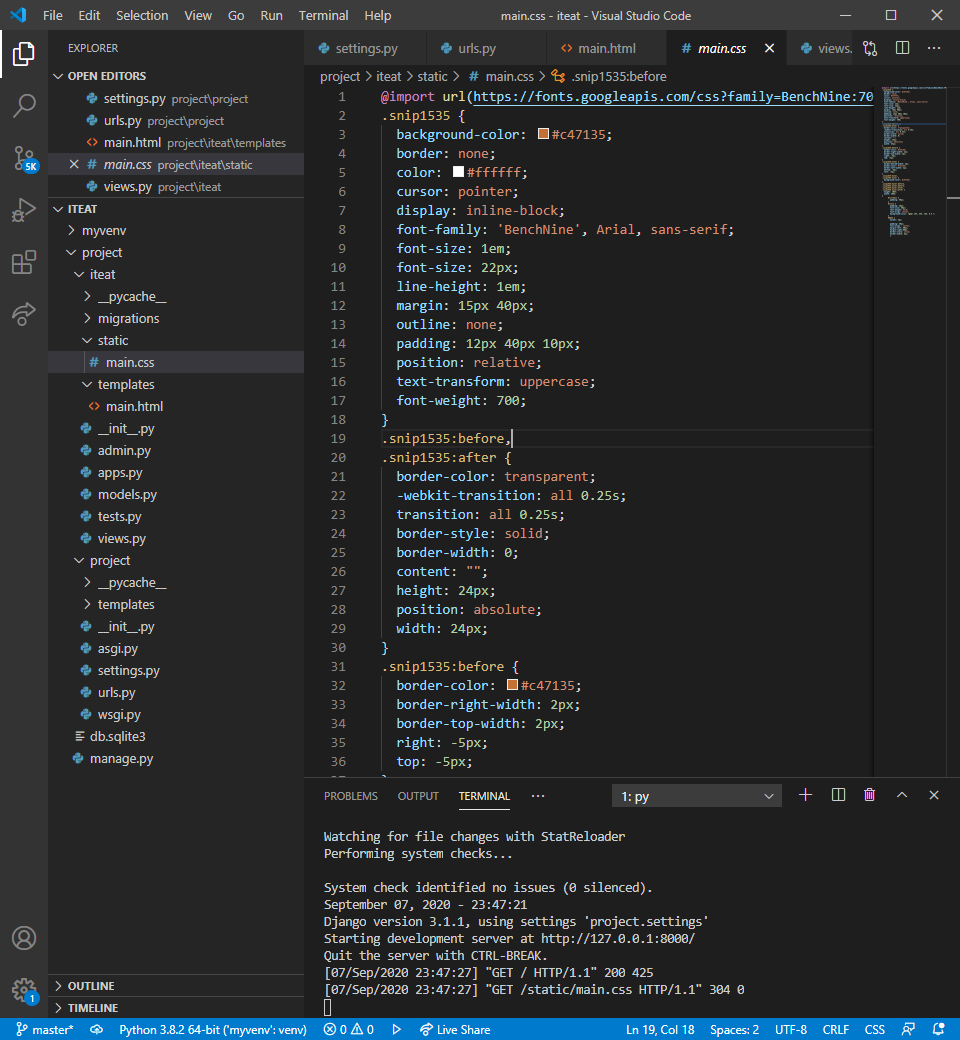 이런 식으로 django에서 css파일을 따로 파일로 적용시켜 사용하려면 잘 따라와 주세요!
