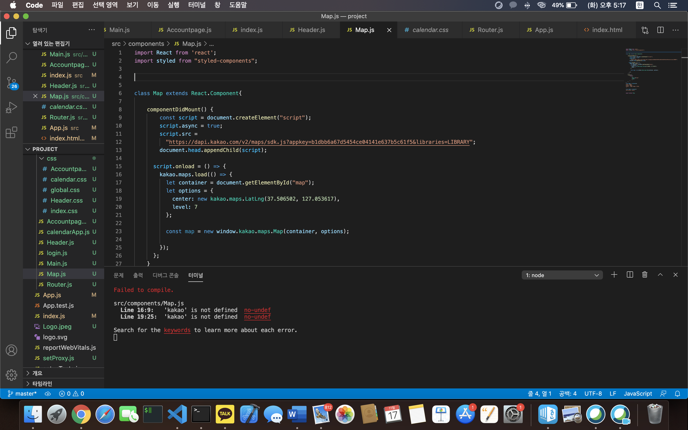 Map.js에 상단부분에 추가해놓자. 추가하지않으면 kakao가 선언되어있지않다고 오류를 던진다.