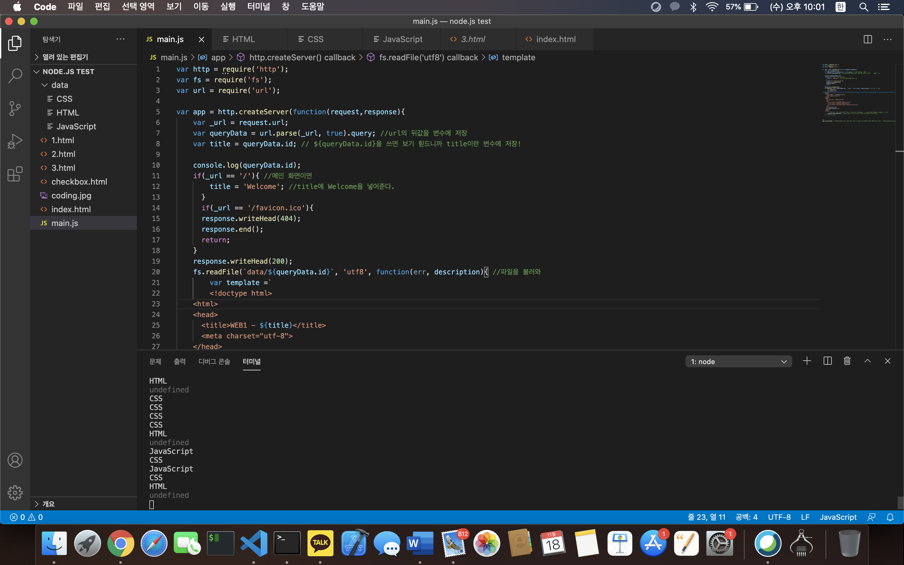 template이라는 변수안에 메인페이지를 구성해놓고 response.end(template);을 통해 템플릿을 가져온다. 보면 data파일을 보자면 안에 파일명이 HTML,CSS,JavaScript로 되어있다. 이것은