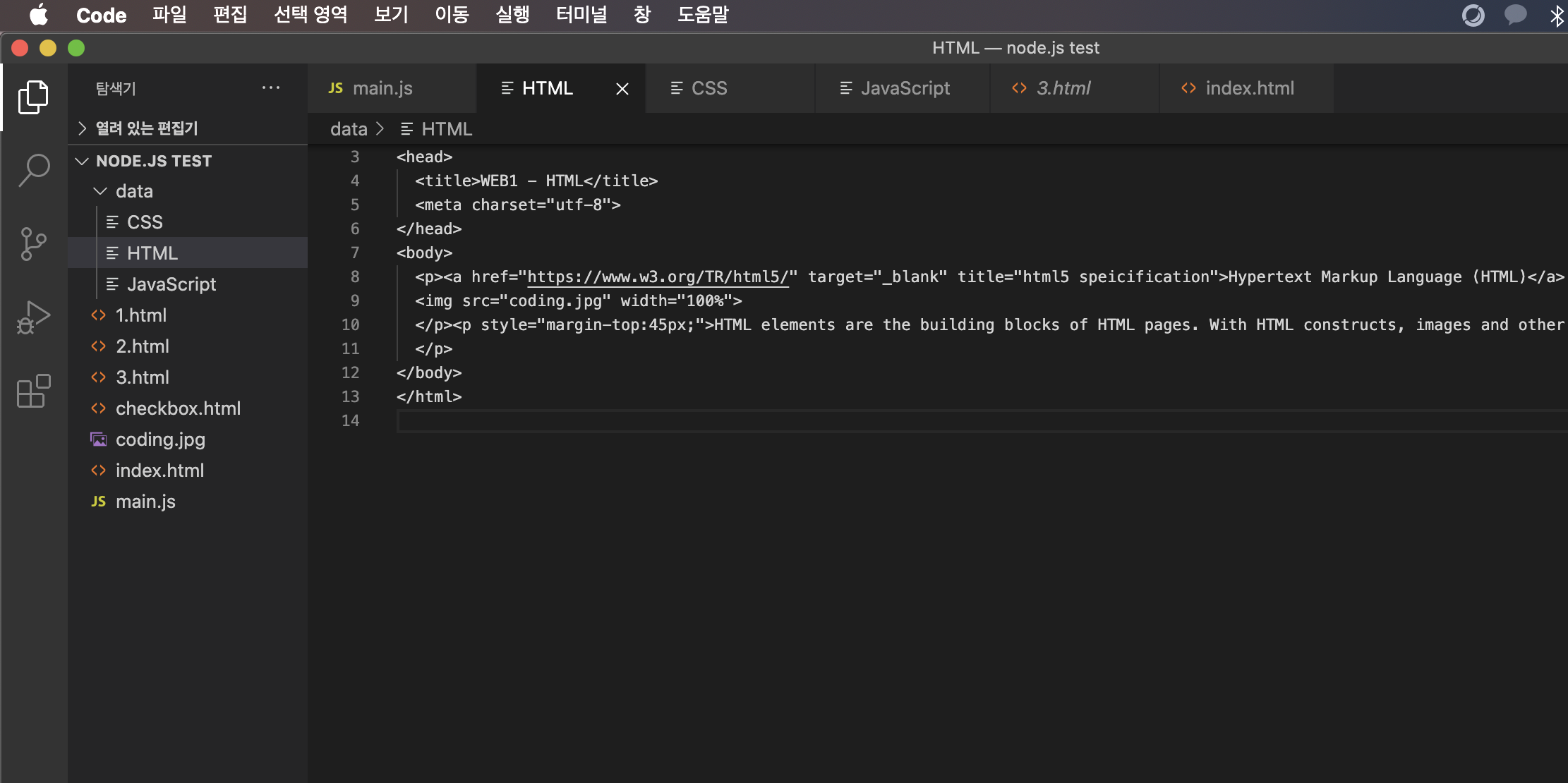 파일구조를 보자면 이런식으로 구성되어있다. 각각 1.html, 2.html, 3.html 파일의 본문을 저장할 data 디렉토리를 생성하여 파일을 만들어준다. 예제 파일은 생활코딩 페이지에 들어가면 git에 첨부되어있는 것을 가져왔다.