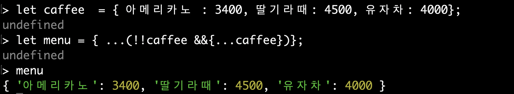 다른 상황을 보자! caffee라는 객체 안에 음료정보와 가격정보가 들어가있다. 이것을 메뉴판에 넣어보고싶다. 이때 객체 안에 조건을 통해서 값을 넣을지 말지도 구조분해할당으로 해줄 수 있다. caffee라는 객체가 있으면 안에다가 값을 넣어주면된다.