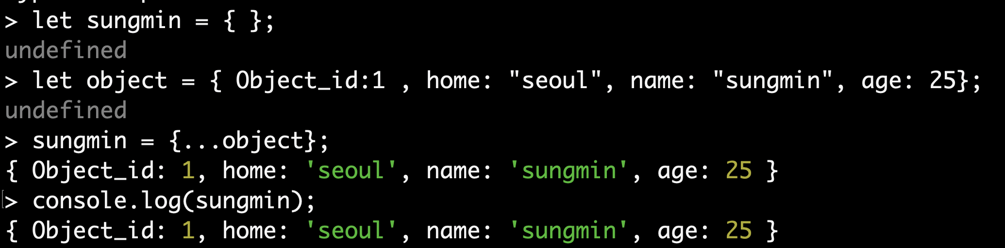 sungmin이라는 객체 안에 object의 값들을 다 넣어주고싶다. 그럴때 ...을 사용하면된다. ...은 객체안에있는 값들을 가져와서 넣어주는 기능을 하는 js의 특징이다. 이 방법을 통해 좀 더 쉽게 데이터를 다룰 수 있다.